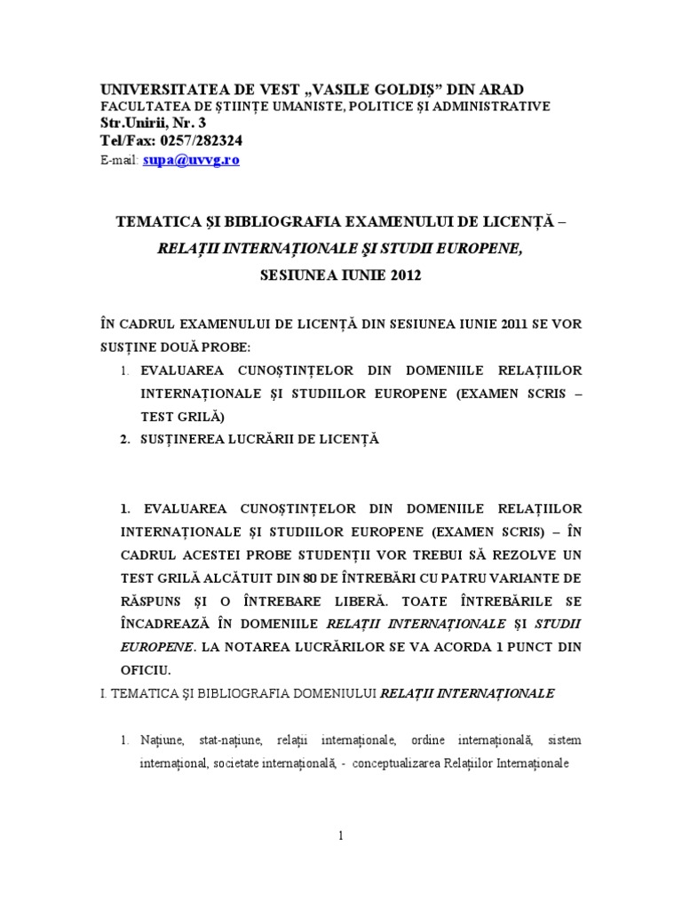 Tematica Licenta Relatii Internationale Si Studii Europene