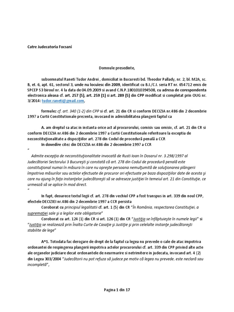 Plangere Impotriva Actelor Procurorului Cf Art 340 Din Cpp Si Probe 367 P 2016