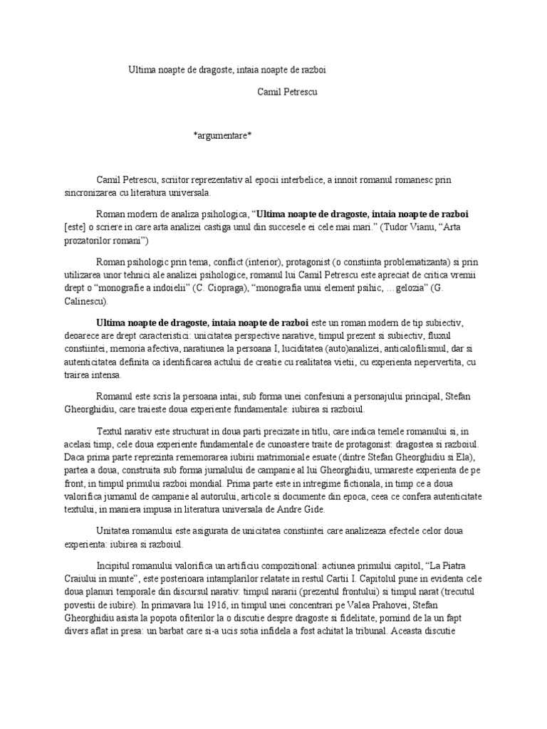 Ultima Noapte De Dragoste Intaia Noapte De Razboi De Camil Petrescu Comentariu Final Doc Pdf Document